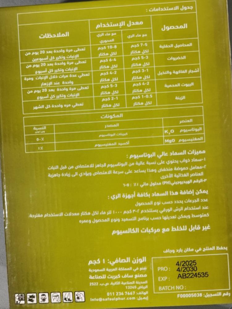 سماد NPK 0 0 50 + 1Mg0 عالي البوتاسيوم